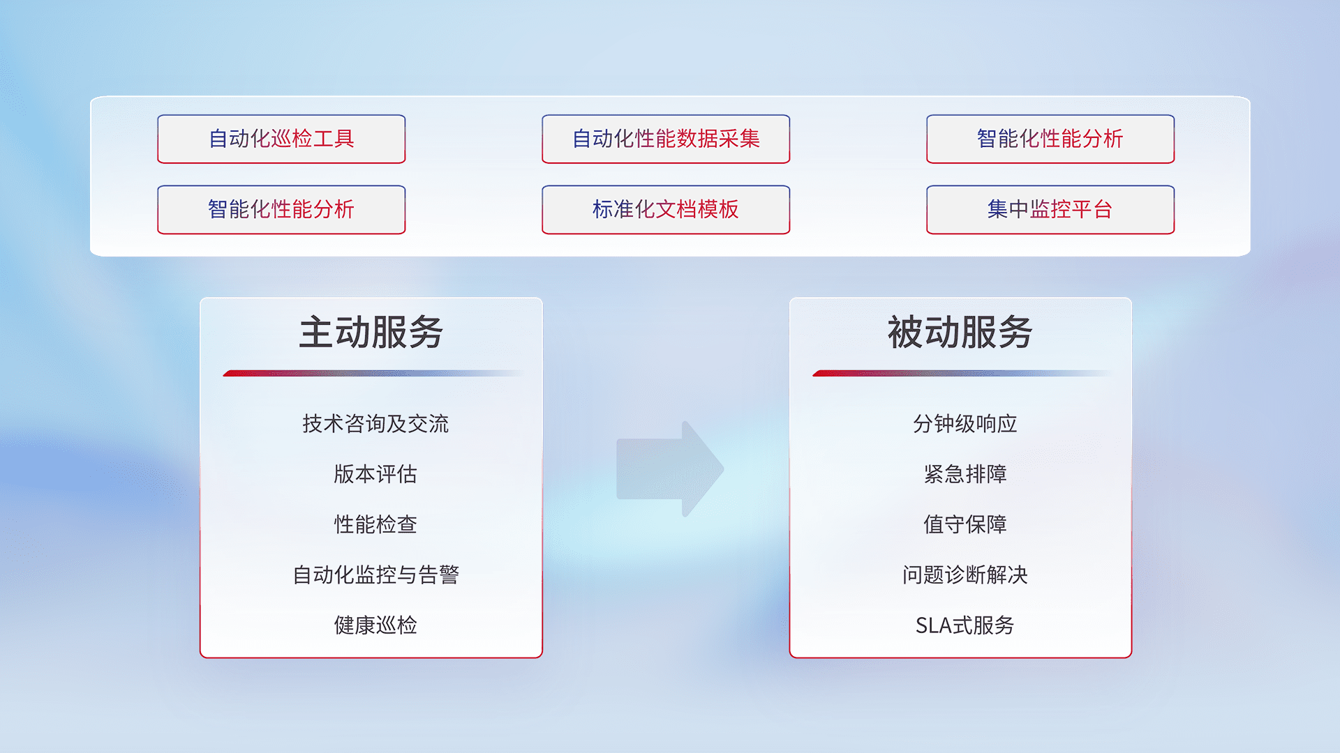 智能化工具和标准化文档,,保障服务质量,,,提供主动服务(包含技术咨询、、、版本评估、、、、性能检查、、、、自动化监控与告警、、健康巡检)和被动服务包含(分钟级响应、、紧急排障、、、值守保障、、、问题诊断解决、、、SLA服务)。。。。